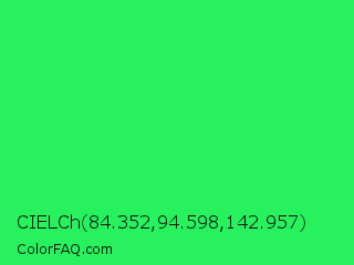 CIELCh 84.352,94.598,142.957 Color is a normal green color and the nearest color is Malachite #0bda51. Hex code #27f25e and RGB value is rgb(39,242,94). In RGB color space, this color is composed of 15% red, 95% green, 37% blue, In CMYK color space, this color is composed of 84% cyan, 0% magenta, 61% yellow , 5% black , In HSL color space, this color has a hue angle of 136° , 89% saturation and 55% lightness.