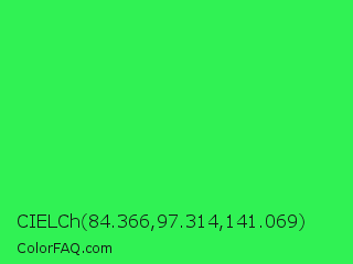 CIELCh 84.366,97.314,141.069 Color is a normal green color and the nearest color is Malachite #0bda51. Hex code #30f254 and RGB value is rgb(48,242,84). In RGB color space, this color is composed of 19% red, 95% green, 33% blue, In CMYK color space, this color is composed of 80% cyan, 0% magenta, 65% yellow , 5% black , In HSL color space, this color has a hue angle of 131° , 88% saturation and 57% lightness.