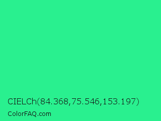 CIELCh 84.368,75.546,153.197 Color is a normal green color and the nearest color is Shamrock #33cc99. Hex code #29f08f and RGB value is rgb(41,240,143). In RGB color space, this color is composed of 16% red, 94% green, 56% blue, In CMYK color space, this color is composed of 83% cyan, 0% magenta, 40% yellow , 6% black , In HSL color space, this color has a hue angle of 151° , 87% saturation and 55% lightness.