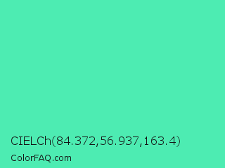 CIELCh 84.372,56.937,163.4 Color is a light green color and the nearest color is Eucalyptus #44d7a8. Hex code #4decb2 and RGB value is rgb(77,236,178). In RGB color space, this color is composed of 30% red, 93% green, 70% blue, In CMYK color space, this color is composed of 67% cyan, 0% magenta, 25% yellow , 7% black , In HSL color space, this color has a hue angle of 158° , 81% saturation and 61% lightness.