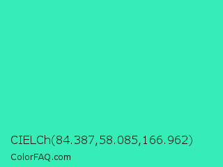 CIELCh 84.387,58.085,166.962 Color is a normal green color and the nearest color is Turquoise #40e0d0. Hex code #36edb8 and RGB value is rgb(54,237,184). In RGB color space, this color is composed of 21% red, 93% green, 72% blue, In CMYK color space, this color is composed of 77% cyan, 0% magenta, 22% yellow , 7% black , In HSL color space, this color has a hue angle of 163° , 84% saturation and 57% lightness.