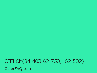 CIELCh 84.403,62.753,162.532 Color is a normal green color and the nearest color is Eucalyptus #44d7a8. Hex code #32eead and RGB value is rgb(50,238,173). In RGB color space, this color is composed of 20% red, 93% green, 68% blue, In CMYK color space, this color is composed of 79% cyan, 0% magenta, 27% yellow , 7% black , In HSL color space, this color has a hue angle of 159° , 85% saturation and 56% lightness.