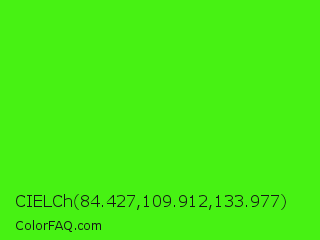 CIELCh 84.427,109.912,133.977 Color is a normal green color and the nearest color is Neon Green #39ff14. Hex code #47f213 and RGB value is rgb(71,242,19). In RGB color space, this color is composed of 28% red, 95% green, 7% blue, In CMYK color space, this color is composed of 71% cyan, 0% magenta, 92% yellow , 5% black , In HSL color space, this color has a hue angle of 106° , 90% saturation and 51% lightness.