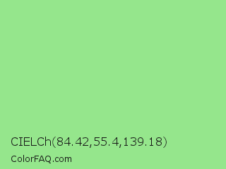 CIELCh 84.42,55.4,139.18 Color is a light green color and the nearest color is Light Green #90ee90. Hex code #95e68c and RGB value is rgb(149,230,140). In RGB color space, this color is composed of 58% red, 90% green, 55% blue, In CMYK color space, this color is composed of 35% cyan, 0% magenta, 39% yellow , 10% black , In HSL color space, this color has a hue angle of 114° , 64% saturation and 73% lightness.