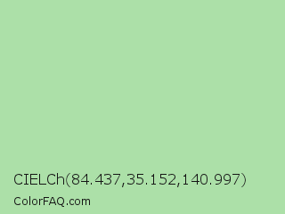 CIELCh 84.437,35.152,140.997 Color is a light green color and the nearest color is Moss Green #addfad. Hex code #ace0a8 and RGB value is rgb(172,224,168). In RGB color space, this color is composed of 67% red, 88% green, 66% blue, In CMYK color space, this color is composed of 23% cyan, 0% magenta, 25% yellow , 12% black , In HSL color space, this color has a hue angle of 116° , 47% saturation and 77% lightness.