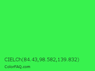 CIELCh 84.43,98.582,139.832 Color is a normal green color and the nearest color is Lime Green #32cd32. Hex code #38f24e and RGB value is rgb(56,242,78). In RGB color space, this color is composed of 22% red, 95% green, 31% blue, In CMYK color space, this color is composed of 77% cyan, 0% magenta, 68% yellow , 5% black , In HSL color space, this color has a hue angle of 127° , 88% saturation and 58% lightness.