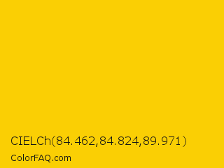 CIELCh 84.462,84.824,89.971 Color is a normal yellow color and the nearest color is Tangerine Yellow #ffcc00. Hex code #facf04 and RGB value is rgb(250,207,4). In RGB color space, this color is composed of 98% red, 81% green, 2% blue, In CMYK color space, this color is composed of 0% cyan, 17% magenta, 98% yellow , 2% black , In HSL color space, this color has a hue angle of 50° , 97% saturation and 50% lightness.