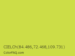 CIELCh 84.486,72.468,109.731 Color is a normal yellow color and the nearest color is Wattle #dcd747. Hex code #ccdd47 and RGB value is rgb(204,221,71). In RGB color space, this color is composed of 80% red, 87% green, 28% blue, In CMYK color space, this color is composed of 8% cyan, 0% magenta, 68% yellow , 13% black , In HSL color space, this color has a hue angle of 67° , 69% saturation and 57% lightness.