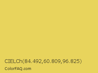 CIELCh 84.492,60.809,96.825 Color is a light yellow color and the nearest color is Confetti #e9d75a. Hex code #e8d45c and RGB value is rgb(232,212,92). In RGB color space, this color is composed of 91% red, 83% green, 36% blue, In CMYK color space, this color is composed of 0% cyan, 9% magenta, 60% yellow , 9% black , In HSL color space, this color has a hue angle of 51° , 75% saturation and 64% lightness.