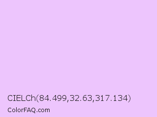 CIELCh 84.499,32.63,317.134 Color is a very light purple color and the nearest color is Electric Lavender #f4bbff. Hex code #edc5fd and RGB value is rgb(237,197,253). In RGB color space, this color is composed of 93% red, 77% green, 99% blue, In CMYK color space, this color is composed of 6% cyan, 22% magenta, 0% yellow , 1% black , In HSL color space, this color has a hue angle of 283° , 93% saturation and 88% lightness.