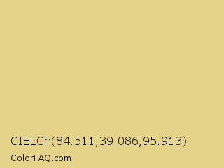 CIELCh 84.511,39.086,95.913 Color is a light yellow color and the nearest color is Putty #e7cd8c. Hex code #e5d389 and RGB value is rgb(229,211,137). In RGB color space, this color is composed of 90% red, 83% green, 54% blue, In CMYK color space, this color is composed of 0% cyan, 8% magenta, 40% yellow , 10% black , In HSL color space, this color has a hue angle of 48° , 64% saturation and 72% lightness.