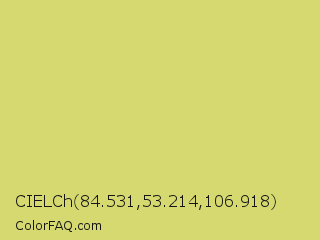 CIELCh 84.531,53.214,106.918 Color is a light yellow color and the nearest color is Booger Buster #dde26a. Hex code #d6d970 and RGB value is rgb(214,217,112). In RGB color space, this color is composed of 84% red, 85% green, 44% blue, In CMYK color space, this color is composed of 1% cyan, 0% magenta, 48% yellow , 15% black , In HSL color space, this color has a hue angle of 62° , 58% saturation and 65% lightness.