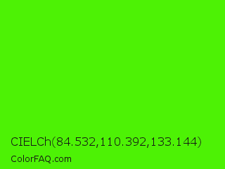 CIELCh 84.532,110.392,133.144 Color is a normal green color and the nearest color is Chlorophyll Green #4aff00. Hex code #4df205 and RGB value is rgb(77,242,5). In RGB color space, this color is composed of 30% red, 95% green, 2% blue, In CMYK color space, this color is composed of 68% cyan, 0% magenta, 98% yellow , 5% black , In HSL color space, this color has a hue angle of 102° , 96% saturation and 48% lightness.