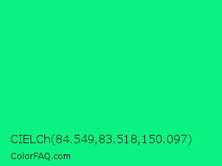 CIELCh 84.549,83.518,150.097 Color is a normal green color and the nearest color is Spring Green #00ff7f. Hex code #0af280 and RGB value is rgb(10,242,128). In RGB color space, this color is composed of 4% red, 95% green, 50% blue, In CMYK color space, this color is composed of 96% cyan, 0% magenta, 47% yellow , 5% black , In HSL color space, this color has a hue angle of 151° , 92% saturation and 49% lightness.