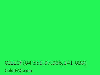 CIELCh 84.551,97.936,141.839 Color is a normal green color and the nearest color is Malachite #0bda51. Hex code #23f356 and RGB value is rgb(35,243,86). In RGB color space, this color is composed of 14% red, 95% green, 34% blue, In CMYK color space, this color is composed of 86% cyan, 0% magenta, 65% yellow , 5% black , In HSL color space, this color has a hue angle of 135° , 90% saturation and 55% lightness.