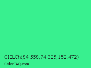 CIELCh 84.558,74.325,152.472 Color is a normal green color and the nearest color is Eucalyptus #44d7a8. Hex code #38f08f and RGB value is rgb(56,240,143). In RGB color space, this color is composed of 22% red, 94% green, 56% blue, In CMYK color space, this color is composed of 77% cyan, 0% magenta, 40% yellow , 6% black , In HSL color space, this color has a hue angle of 148° , 86% saturation and 58% lightness.