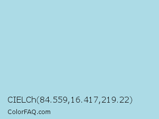 CIELCh 84.559,16.417,219.22 Color is a light cyan color and the nearest color is Light Blue #add8e6. Hex code #acdbe6 and RGB value is rgb(172,219,230). In RGB color space, this color is composed of 67% red, 86% green, 90% blue, In CMYK color space, this color is composed of 25% cyan, 5% magenta, 0% yellow , 10% black , In HSL color space, this color has a hue angle of 191° , 54% saturation and 79% lightness.