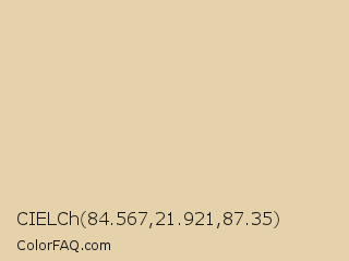 CIELCh 84.567,21.921,87.35 Color is a light orange color and the nearest color is Hampton #e5d8af. Hex code #e5d1aa and RGB value is rgb(229,209,170). In RGB color space, this color is composed of 90% red, 82% green, 67% blue, In CMYK color space, this color is composed of 0% cyan, 9% magenta, 26% yellow , 10% black , In HSL color space, this color has a hue angle of 40° , 53% saturation and 78% lightness.