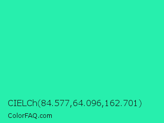 CIELCh 84.577,64.096,162.701 Color is a normal green color and the nearest color is Eucalyptus #44d7a8. Hex code #27efad and RGB value is rgb(39,239,173). In RGB color space, this color is composed of 15% red, 94% green, 68% blue, In CMYK color space, this color is composed of 84% cyan, 0% magenta, 28% yellow , 6% black , In HSL color space, this color has a hue angle of 160° , 86% saturation and 55% lightness.