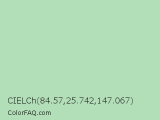 CIELCh 84.57,25.742,147.067 Color is a light green color and the nearest color is Fringy Flower #b1e2c1. Hex code #b2deb8 and RGB value is rgb(178,222,184). In RGB color space, this color is composed of 70% red, 87% green, 72% blue, In CMYK color space, this color is composed of 20% cyan, 0% magenta, 17% yellow , 13% black , In HSL color space, this color has a hue angle of 128° , 40% saturation and 78% lightness.