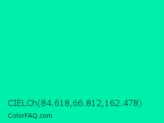 CIELCh 84.618,66.812,162.478 Color is a normal green color and the nearest color is Medium Spring Green #00fa9a. Hex code #00f0ab and RGB value is rgb(0,240,171). In RGB color space, this color is composed of 0% red, 94% green, 67% blue, In CMYK color space, this color is composed of 100% cyan, 0% magenta, 29% yellow , 6% black , In HSL color space, this color has a hue angle of 163° , 100% saturation and 47% lightness.