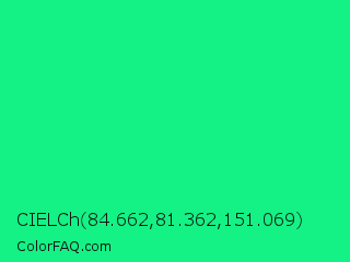 CIELCh 84.662,81.362,151.069 Color is a normal green color and the nearest color is Spring Green #00ff7f. Hex code #14f285 and RGB value is rgb(20,242,133). In RGB color space, this color is composed of 8% red, 95% green, 52% blue, In CMYK color space, this color is composed of 92% cyan, 0% magenta, 45% yellow , 5% black , In HSL color space, this color has a hue angle of 151° , 90% saturation and 51% lightness.