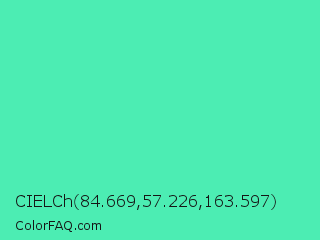 CIELCh 84.669,57.226,163.597 Color is a light green color and the nearest color is Eucalyptus #44d7a8. Hex code #4cedb3 and RGB value is rgb(76,237,179). In RGB color space, this color is composed of 30% red, 93% green, 70% blue, In CMYK color space, this color is composed of 68% cyan, 0% magenta, 24% yellow , 7% black , In HSL color space, this color has a hue angle of 158° , 82% saturation and 61% lightness.