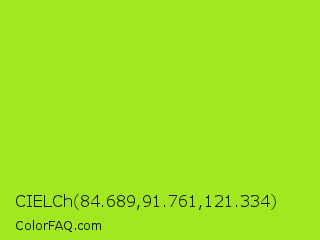 CIELCh 84.689,91.761,121.334 Color is a normal green color and the nearest color is Inch Worm #b0e313. Hex code #a1e821 and RGB value is rgb(161,232,33). In RGB color space, this color is composed of 63% red, 91% green, 13% blue, In CMYK color space, this color is composed of 31% cyan, 0% magenta, 86% yellow , 9% black , In HSL color space, this color has a hue angle of 81° , 81% saturation and 52% lightness.