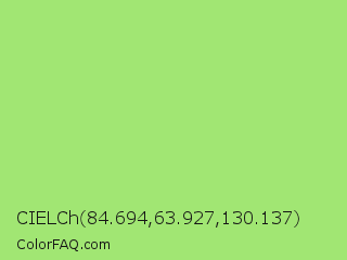 CIELCh 84.694,63.927,130.137 Color is a light green color and the nearest color is Feijoa #9fdd8c. Hex code #a1e673 and RGB value is rgb(161,230,115). In RGB color space, this color is composed of 63% red, 90% green, 45% blue, In CMYK color space, this color is composed of 30% cyan, 0% magenta, 50% yellow , 10% black , In HSL color space, this color has a hue angle of 96° , 70% saturation and 68% lightness.
