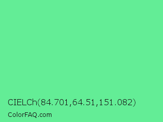 CIELCh 84.701,64.51,151.082 Color is a light green color and the nearest color is Very Light Malachite Green #64e986. Hex code #63ed96 and RGB value is rgb(99,237,150). In RGB color space, this color is composed of 39% red, 93% green, 59% blue, In CMYK color space, this color is composed of 58% cyan, 0% magenta, 37% yellow , 7% black , In HSL color space, this color has a hue angle of 142° , 79% saturation and 66% lightness.
