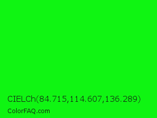 CIELCh 84.715,114.607,136.289 Color is a normal green color and the nearest color is Green #00ff00. Hex code #0ff512 and RGB value is rgb(15,245,18). In RGB color space, this color is composed of 6% red, 96% green, 7% blue, In CMYK color space, this color is composed of 94% cyan, 0% magenta, 93% yellow , 4% black , In HSL color space, this color has a hue angle of 121° , 92% saturation and 51% lightness.