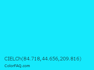 CIELCh 84.718,44.656,209.816 Color is a normal cyan color and the nearest color is Loeen #15f2fd. Hex code #14e9fc and RGB value is rgb(20,233,252). In RGB color space, this color is composed of 8% red, 91% green, 99% blue, In CMYK color space, this color is composed of 92% cyan, 8% magenta, 0% yellow , 1% black , In HSL color space, this color has a hue angle of 185° , 97% saturation and 53% lightness.