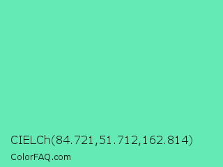 CIELCh 84.721,51.712,162.814 Color is a light green color and the nearest color is Medium Aquamarine #66ddaa. Hex code #64ebb5 and RGB value is rgb(100,235,181). In RGB color space, this color is composed of 39% red, 92% green, 71% blue, In CMYK color space, this color is composed of 57% cyan, 0% magenta, 23% yellow , 8% black , In HSL color space, this color has a hue angle of 156° , 77% saturation and 66% lightness.