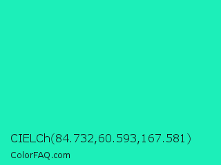 CIELCh 84.732,60.593,167.581 Color is a normal cyan color and the nearest color is Turquoise PWG #30d5c8. Hex code #1cefb9 and RGB value is rgb(28,239,185). In RGB color space, this color is composed of 11% red, 94% green, 73% blue, In CMYK color space, this color is composed of 88% cyan, 0% magenta, 23% yellow , 6% black , In HSL color space, this color has a hue angle of 165° , 87% saturation and 52% lightness.