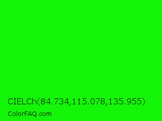 CIELCh 84.734,115.078,135.955 Color is a normal green color and the nearest color is Green #00ff00. Hex code #15f50a and RGB value is rgb(21,245,10). In RGB color space, this color is composed of 8% red, 96% green, 4% blue, In CMYK color space, this color is composed of 91% cyan, 0% magenta, 96% yellow , 4% black , In HSL color space, this color has a hue angle of 117° , 92% saturation and 50% lightness.