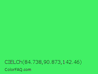 CIELCh 84.738,90.873,142.46 Color is a normal green color and the nearest color is UFO Green #3cd070. Hex code #40f263 and RGB value is rgb(64,242,99). In RGB color space, this color is composed of 25% red, 95% green, 39% blue, In CMYK color space, this color is composed of 74% cyan, 0% magenta, 59% yellow , 5% black , In HSL color space, this color has a hue angle of 132° , 87% saturation and 60% lightness.