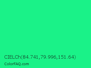 CIELCh 84.741,79.996,151.64 Color is a normal green color and the nearest color is Spring Green #00ff7f. Hex code #1af288 and RGB value is rgb(26,242,136). In RGB color space, this color is composed of 10% red, 95% green, 53% blue, In CMYK color space, this color is composed of 89% cyan, 0% magenta, 44% yellow , 5% black , In HSL color space, this color has a hue angle of 151° , 89% saturation and 53% lightness.