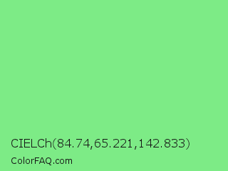 CIELCh 84.74,65.221,142.833 Color is a light green color and the nearest color is Pastel Green #77dd77. Hex code #7deb86 and RGB value is rgb(125,235,134). In RGB color space, this color is composed of 49% red, 92% green, 53% blue, In CMYK color space, this color is composed of 47% cyan, 0% magenta, 43% yellow , 8% black , In HSL color space, this color has a hue angle of 125° , 73% saturation and 71% lightness.