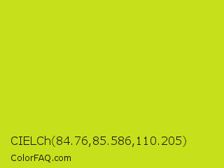 CIELCh 84.76,85.586,110.205 Color is a normal yellow color and the nearest color is Las Palmas #c6e610. Hex code #c7e01c and RGB value is rgb(199,224,28). In RGB color space, this color is composed of 78% red, 88% green, 11% blue, In CMYK color space, this color is composed of 11% cyan, 0% magenta, 88% yellow , 12% black , In HSL color space, this color has a hue angle of 68° , 78% saturation and 49% lightness.