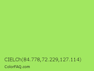 CIELCh 84.778,72.229,127.114 Color is a light green color and the nearest color is Inchworm #b2ec5d. Hex code #a1e760 and RGB value is rgb(161,231,96). In RGB color space, this color is composed of 63% red, 91% green, 38% blue, In CMYK color space, this color is composed of 30% cyan, 0% magenta, 58% yellow , 9% black , In HSL color space, this color has a hue angle of 91° , 74% saturation and 64% lightness.