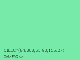 CIELCh 84.808,51.93,155.27 Color is a light green color and the nearest color is Medium Aquamarine #66ddaa. Hex code #77eaa9 and RGB value is rgb(119,234,169). In RGB color space, this color is composed of 47% red, 92% green, 66% blue, In CMYK color space, this color is composed of 49% cyan, 0% magenta, 28% yellow , 8% black , In HSL color space, this color has a hue angle of 146° , 73% saturation and 69% lightness.