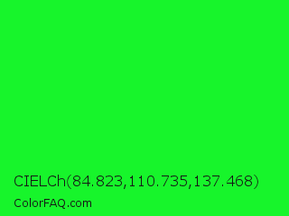 CIELCh 84.823,110.735,137.468 Color is a normal green color and the nearest color is Neon Green #39ff14. Hex code #17f52b and RGB value is rgb(23,245,43). In RGB color space, this color is composed of 9% red, 96% green, 17% blue, In CMYK color space, this color is composed of 91% cyan, 0% magenta, 82% yellow , 4% black , In HSL color space, this color has a hue angle of 125° , 92% saturation and 53% lightness.