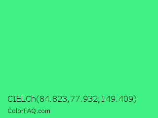 CIELCh 84.823,77.932,149.409 Color is a normal green color and the nearest color is Very Light Malachite Green #64e986. Hex code #3ff185 and RGB value is rgb(63,241,133). In RGB color space, this color is composed of 25% red, 95% green, 52% blue, In CMYK color space, this color is composed of 74% cyan, 0% magenta, 45% yellow , 5% black , In HSL color space, this color has a hue angle of 144° , 86% saturation and 60% lightness.