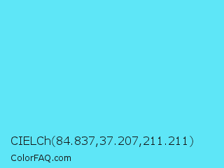 CIELCh 84.837,37.207,211.211 Color is a light cyan color and the nearest color is Turquoise Blue #6cdae7. Hex code #5ee6f7 and RGB value is rgb(94,230,247). In RGB color space, this color is composed of 37% red, 90% green, 97% blue, In CMYK color space, this color is composed of 62% cyan, 7% magenta, 0% yellow , 3% black , In HSL color space, this color has a hue angle of 187° , 91% saturation and 67% lightness.