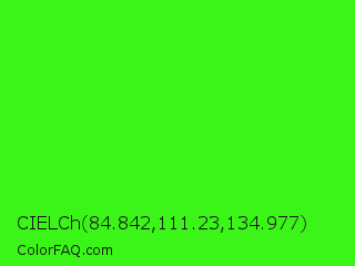 CIELCh 84.842,111.23,134.977 Color is a normal green color and the nearest color is Neon Green #39ff14. Hex code #3bf418 and RGB value is rgb(59,244,24). In RGB color space, this color is composed of 23% red, 96% green, 9% blue, In CMYK color space, this color is composed of 76% cyan, 0% magenta, 90% yellow , 4% black , In HSL color space, this color has a hue angle of 110° , 91% saturation and 53% lightness.