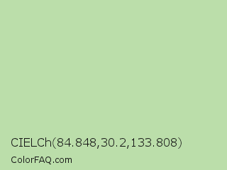 CIELCh 84.848,30.2,133.808 Color is a light green color and the nearest color is Sprout #c1d7b0. Hex code #bbdeaa and RGB value is rgb(187,222,170). In RGB color space, this color is composed of 73% red, 87% green, 67% blue, In CMYK color space, this color is composed of 16% cyan, 0% magenta, 23% yellow , 13% black , In HSL color space, this color has a hue angle of 100° , 44% saturation and 77% lightness.