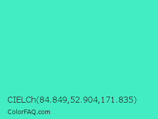CIELCh 84.849,52.904,171.835 Color is a normal cyan color and the nearest color is Turquoise #40e0d0. Hex code #42edc4 and RGB value is rgb(66,237,196). In RGB color space, this color is composed of 26% red, 93% green, 77% blue, In CMYK color space, this color is composed of 72% cyan, 0% magenta, 17% yellow , 7% black , In HSL color space, this color has a hue angle of 166° , 83% saturation and 59% lightness.