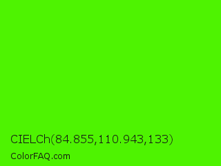 CIELCh 84.855,110.943,133 Color is a normal green color and the nearest color is Chlorophyll Green #4aff00. Hex code #4ef301 and RGB value is rgb(78,243,1). In RGB color space, this color is composed of 31% red, 95% green, 0% blue, In CMYK color space, this color is composed of 68% cyan, 0% magenta, 100% yellow , 5% black , In HSL color space, this color has a hue angle of 101° , 99% saturation and 48% lightness.