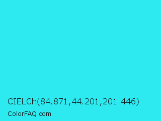 CIELCh 84.871,44.201,201.446 Color is a normal cyan color and the nearest color is Loeen #15f2fd. Hex code #2deaf1 and RGB value is rgb(45,234,241). In RGB color space, this color is composed of 18% red, 92% green, 95% blue, In CMYK color space, this color is composed of 81% cyan, 3% magenta, 0% yellow , 5% black , In HSL color space, this color has a hue angle of 182° , 88% saturation and 56% lightness.