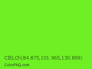 CIELCh 84.875,101.965,130.899 Color is a normal green color and the nearest color is Spring Frost #87ff2a. Hex code #6ef024 and RGB value is rgb(110,240,36). In RGB color space, this color is composed of 43% red, 94% green, 14% blue, In CMYK color space, this color is composed of 54% cyan, 0% magenta, 85% yellow , 6% black , In HSL color space, this color has a hue angle of 98° , 87% saturation and 54% lightness.